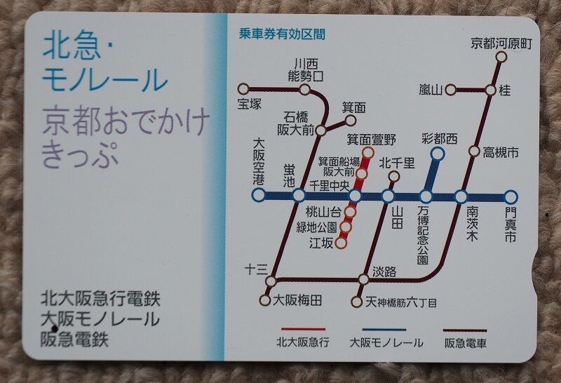 今日使うきっぷはお値段なんと1200円。モノレールか阪急のどちらかでも全部乗れば1200円で収まらないから、超お買い得といえる。最初の計画では北急を初日にと考えていたが、阪急のプライベースは土日の方が運転本数が多いので、これを土曜にあてることにした。