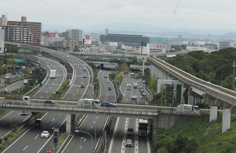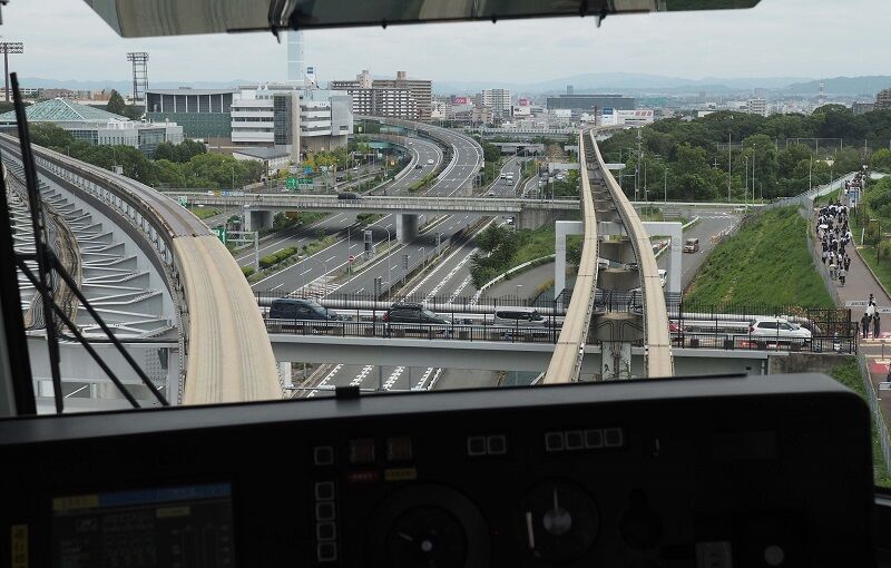 発車すると高度を上げ、中央環状線と中国自動車道を一気に跨ぐ。右が門真市に向かう線路。何度見てもこの光景は凄いと思う。
