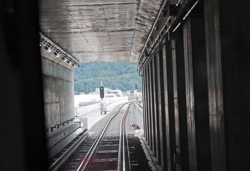 トンネルの上(矢印の所)までは道路から直接移動できず、いったん駅近くまで戻ってUターンする。じりじりと暑くなってきたが、まだ耐えられる。ここでの2度目はまずないだろうから気合いを入れて撮る。