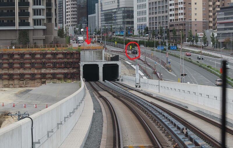 トンネルの出口までは駅から7・8分、〇印の所に来た。道路は箕面萱野に向かってかなり下り込んでいるのがわかる。