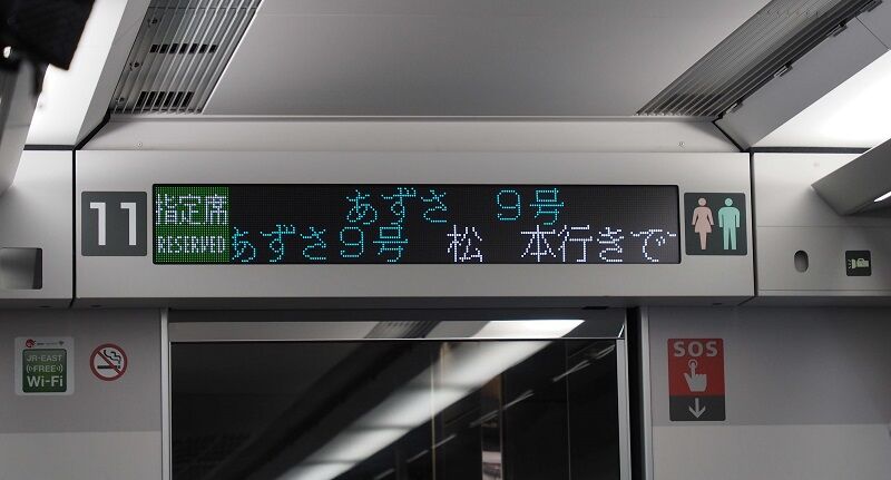 9日は8時ちょうどではなく新宿9時発の「あずさ9号」に乗車。先頭から2両目の11号車(モハE352-11)の10Dだった。E353系に乗るのは2度目になる。朝の混雑で新宿発が6分延となってそのまま遅れを回復できず、11:45頃に松本到着。