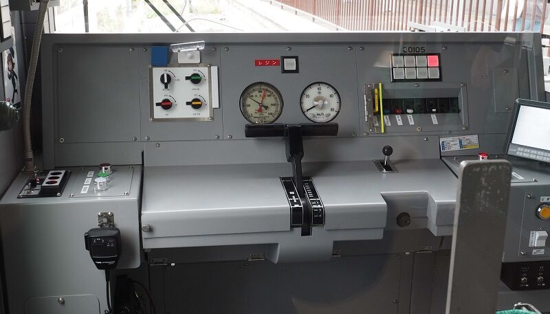 運転台はすっきりしている。圧力計の左はドア開閉の切替スイッチで、無人駅では各車の中ドアから乗車、先頭車の前ドアから降車となる。速度計は80km/hまでしかなく、実際の最高速度は50km/hくらいだった。