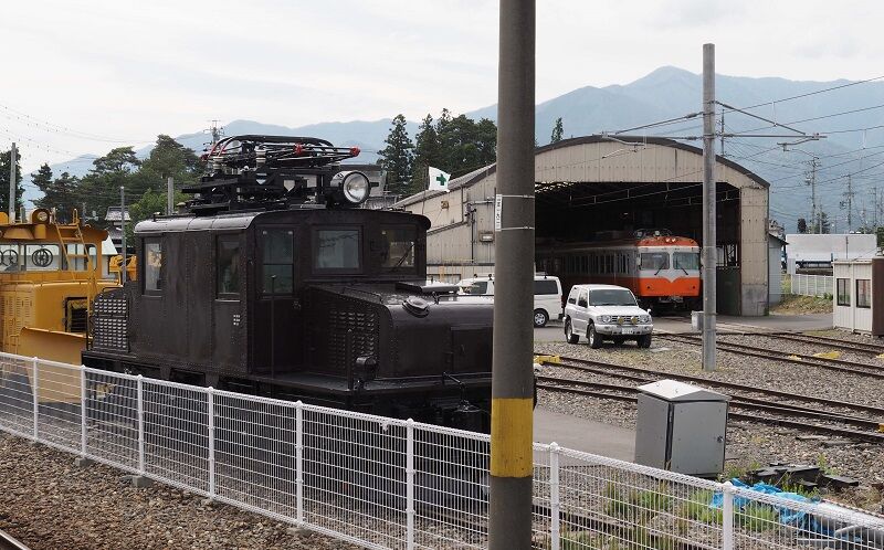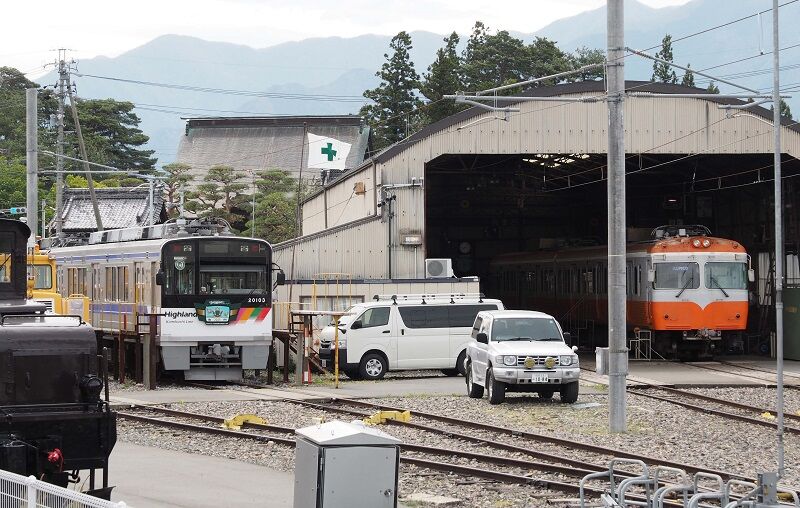ホームから車庫が見渡せる。手前のED301は車籍がないが綺麗になっている。建屋に入っているのは元京王の3003-3004で、今年の3月9日がラストランとなった。