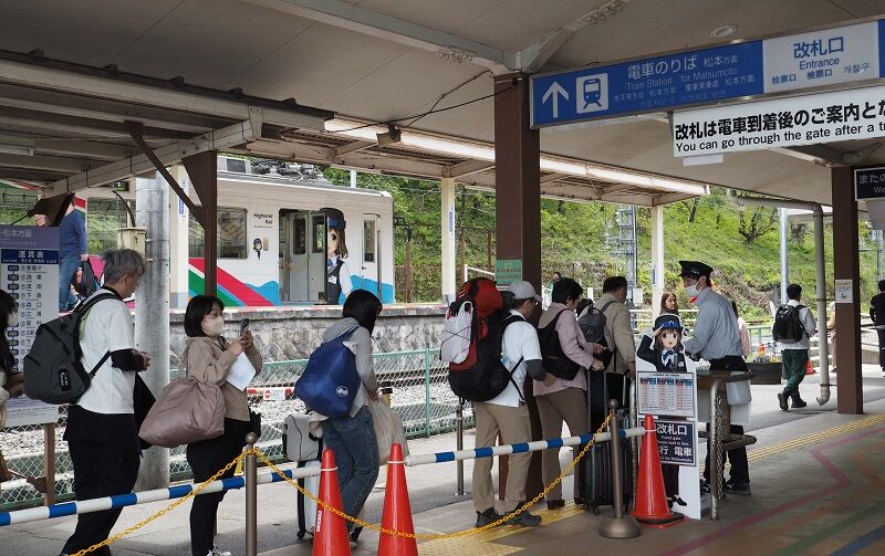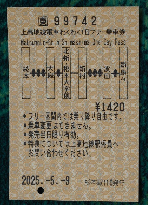 一旦改札を出て、松電の1日乗車券を買う。有人窓口がなく自販機にも案内がないから、予備知識がないと買いそびれる。全線の往復と同額だから1回途中下車すればモトは取れる。