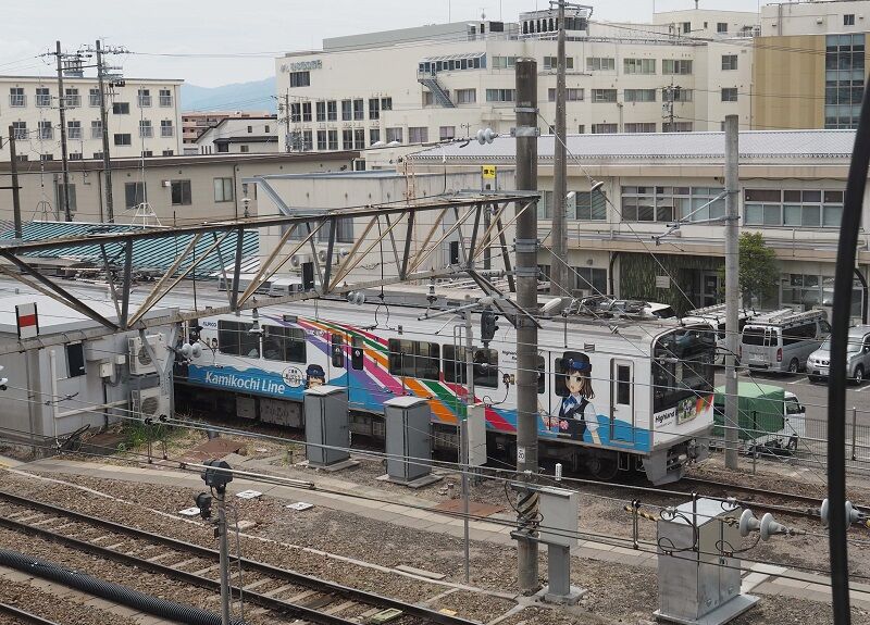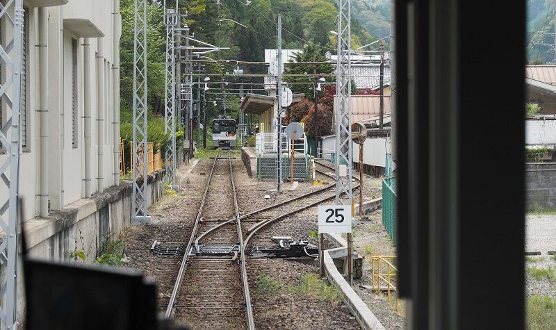 運転間隔は概ね40分前後。松本~新島々間14.4kmを30分で走るから表定速度は28.8km/hとなる。上田交通より少し長いが、朝を除き2列車で運転しているのは同じ。