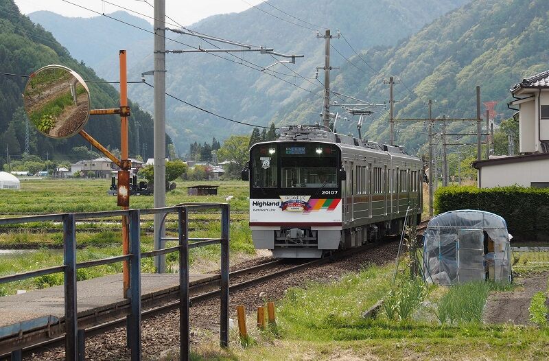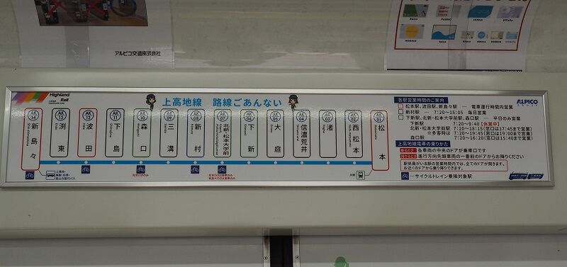 車内はおとなしい感じ。もともとドアが連結面寄りだったからワンマン化には都合がよい。前方の見通しはあまりよくないのでカブリ付きは止めて座席に座る。松電に乗るのは2度目で、一度目はパノラマエクスプレスアルプスの乗車ツアーの時、折返し時間を利用して数駅乗っただけだから、全線乗車は今回が初めてになる。