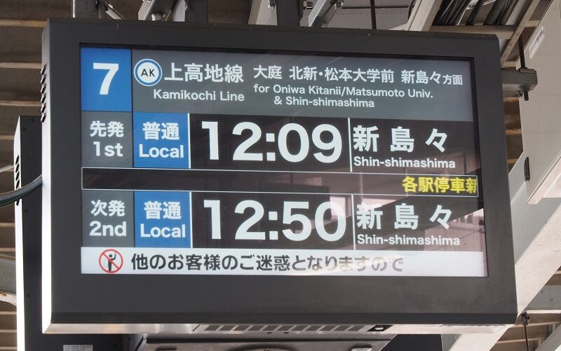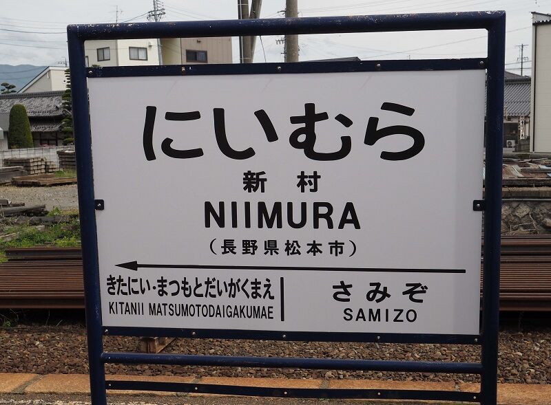 このあたりでは新を「にい」と読むらしい。新村(にいむら)の次の駅は北新・松本大学前(きたにいまつもとだいがくまえ)だし。