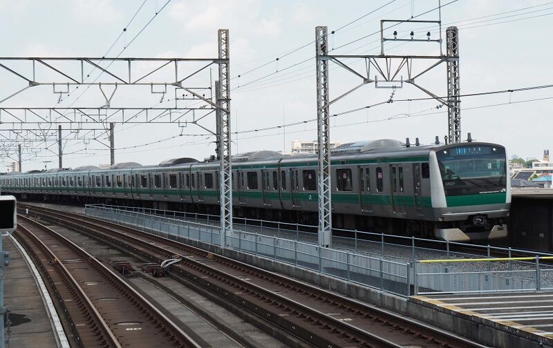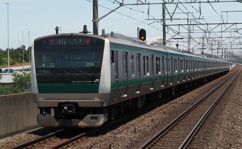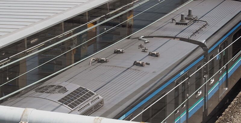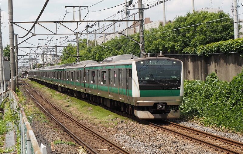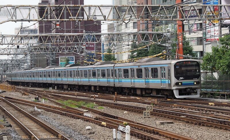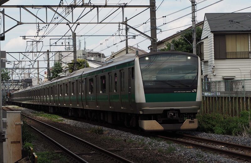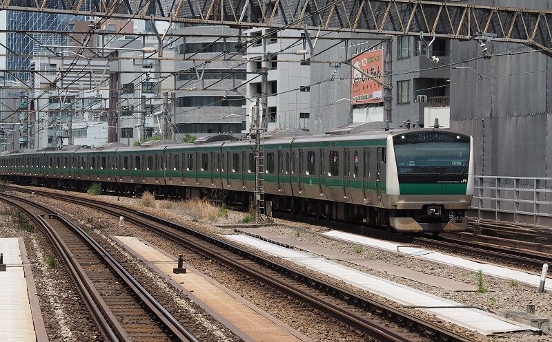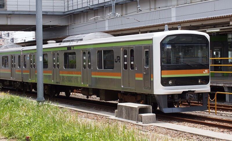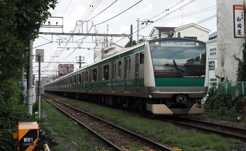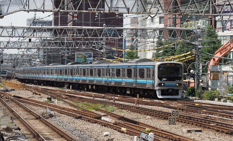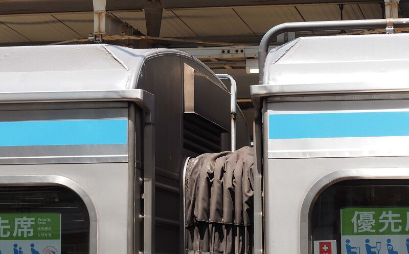E235系と同様の継ぎ目が目立たないステンレス車体で、前面はシグ鉄さん言うところのウヘヘ顔。よく見ればE233系と同じようだけど、塗装でこれだけ印象が変わるという見本になる。写真は第1編成で車号の下3桁は川越寄りから101~110となり、号車番号と車号末尾が一致するようになった。これだと編成番号を表すのは100位だけだから9本で車号がいっぱいになってしまう。8本で足りるから支障ないということなのだろうか。
