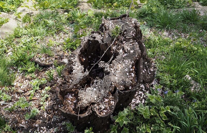 数年前に切られた切り株。見た目はそこそこでも芯がスカスカになっている。