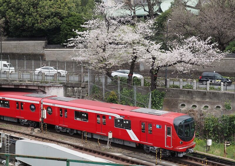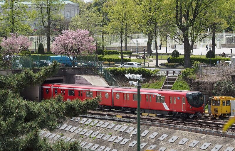 4月8日、天気は下り坂という予報なので、午前中に1箇所だけ狙ってみた。地下鉄丸ノ内線が神田川を渡る所で、バックに桜が2本ある。もう02系は来ないから、1本撮ればよい。