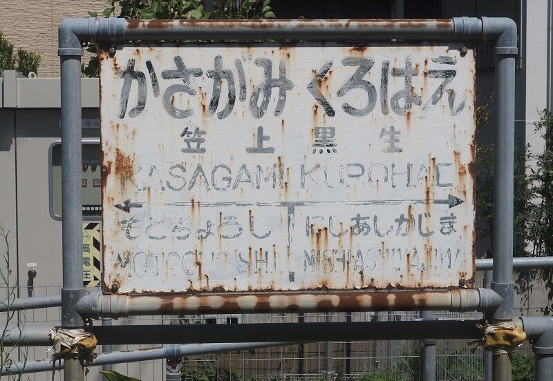 駅名標はかなり掠れている。もう1箇所のネーミングライツで「髪毛黒生」になっているのはそこそこ綺麗だった。