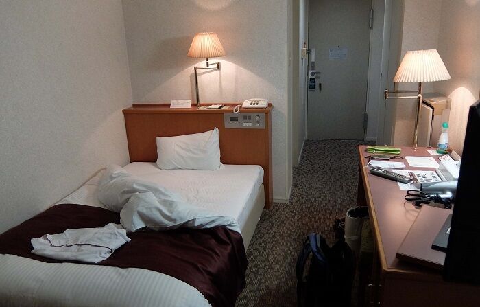 部屋は必要最小限の広さだが、窮屈感はない。スタンドが画面左手前も含めて3台あるのにどれも調光できず、常夜灯がないのは不便。冷蔵庫は運転状態になるとガラガラ音が響く。まぁ、そのため眠れないほどではなかったけど。