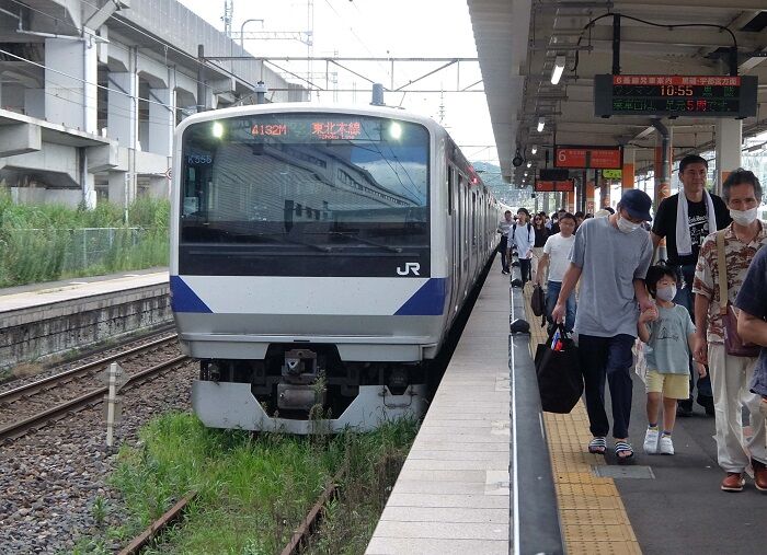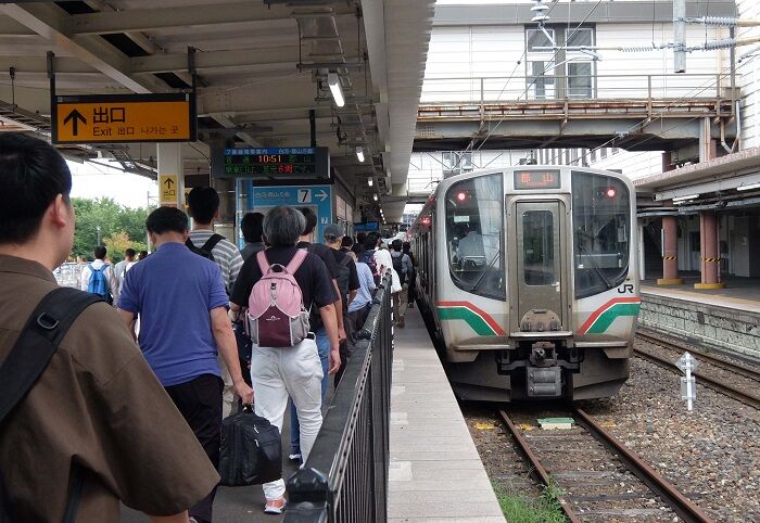 以前、黒磯~新白河間はキハ110系の2連だったが、今はE531系の5連になっている。3連から5連に乗継ぐのだからそこそこ余裕はあるはずだ。それにしても土曜のこの時間にこの人数は尋常ではない。18きっぷ利用の割合はどのくらいなのだろうか。