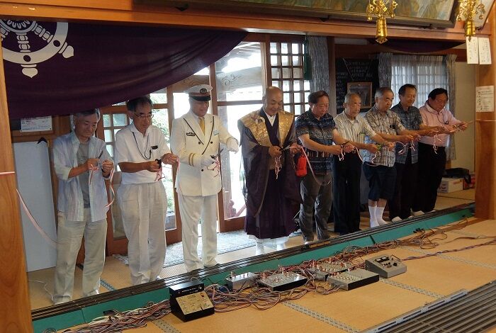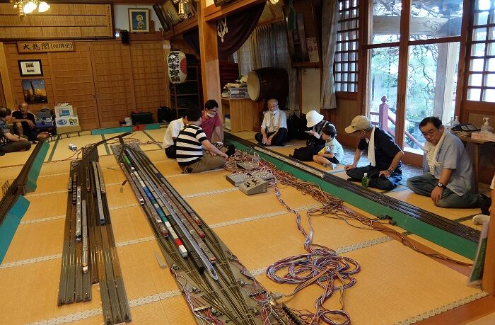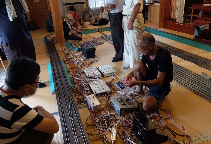本堂はすでにレールが敷かれている。複雑な電気配線はF氏しかわからない。「えぇと、ここを結ぶコードはどれだっけ」。2台のコントローラーが並んでいては使いにくいので、このあと、1台をポイント関係のコントロールボードの反対側に移した。