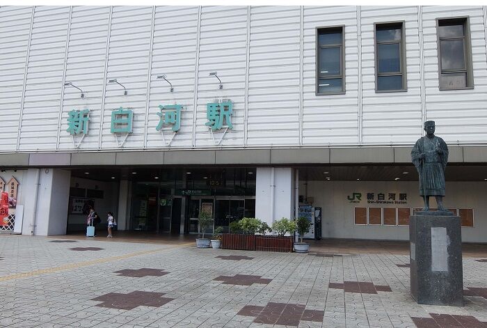 新白河で改札の外に出るのは初めて。右の銅像は松尾芭蕉だ。運転会の主宰者であるF氏の車に乗せてもらい、会場に向かう。