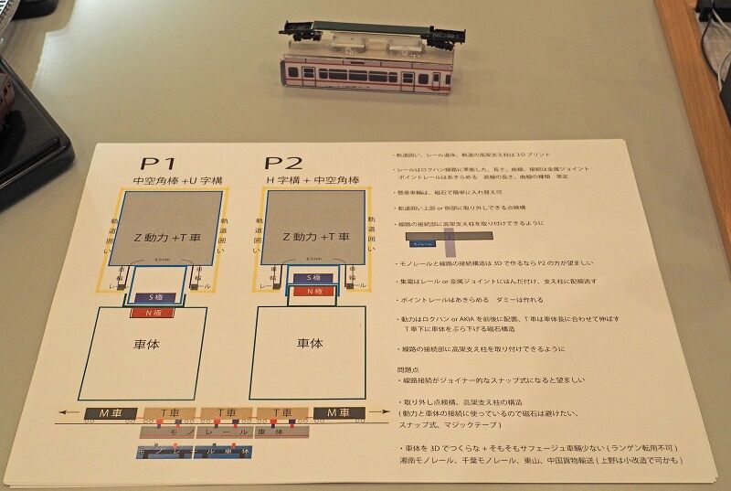 軌道桁の中に動力車があり、車両はマグネットでぶら下がっているようだ。なかなかユニークな発想で、現在は諦めているポイントにも挑戦して欲しい。