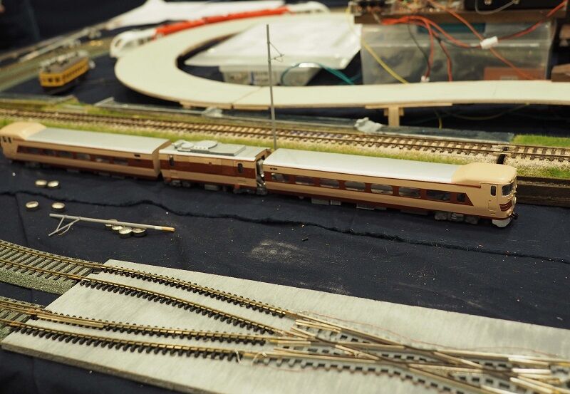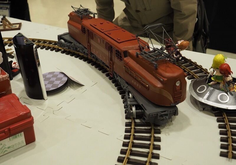 こちらは卓上電鉄。JAMで見たGG1も走るのは初めて見る。ご覧のとおり、台車枠と先台車の2段構えでカーブに対応する。