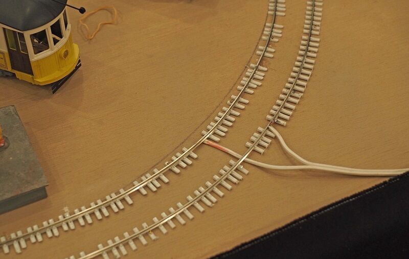 その回りを走るOゲージの線路は、HOのフレキレールをバラしてスパイクし直したようだ。う~ん、こういうのもありか。