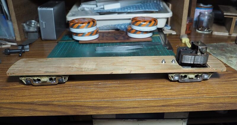 10月27日、車体幅の維持と屋根板の取付けを兼ねて横梁をハンダ付けする。モーターの位置を避け、前後と真ん中の3箇所。車体幅が60mmになるには58.6mmにする必要があるので、慎重にヤスリがけして調整した。