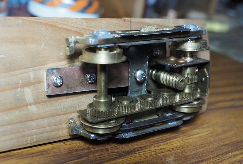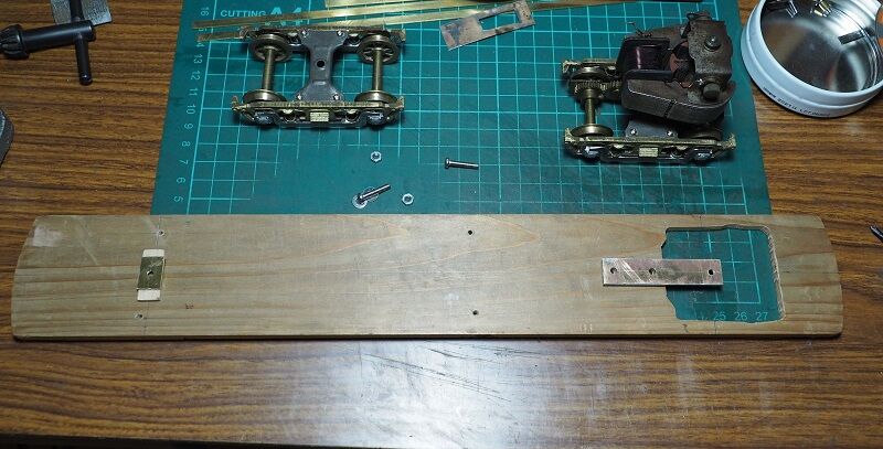 横梁は0.4tとしたのだが、ハンダ付けの熱で反りが出てしまった。無理に直すとハンダが外れるので、一旦外して1×3の帯材で補強を入れた。